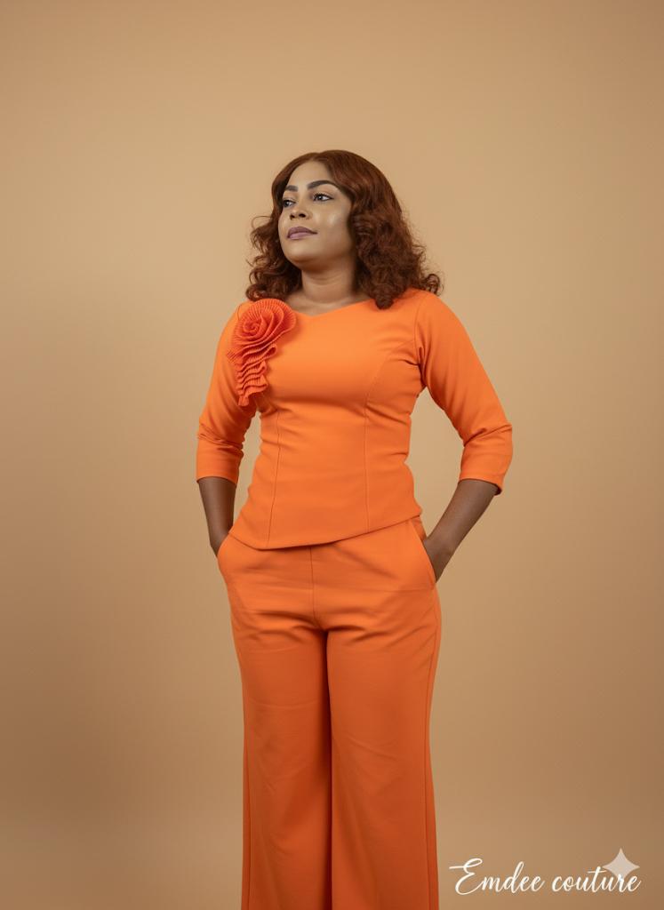 A tailored, three-quarter sleeve blouse featuring an asymmetrical neckline. Its most prominent detail is a large, architectural ruffle rosette on the right shoulder, adding texture and a focal point to the solid color. High-waisted, wide-leg trousers that provide a structured yet flowing silhouette. They include functional side pockets, as shown by the model’s pose.