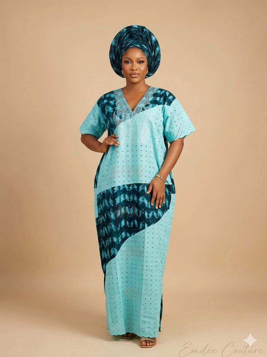 This beautiful full-length A-line gown showcases a stunning juxtaposition of traditional Nigerian craftsmanship and modern design. It is meticulously crafted with a sophisticated patchwork that alternates between breathable, light blue cotton-eyelet lace with crystal embellishments and rich, deep teal Adire fabric, dyed using the Adire Alabela (wax-resist) technique with a dynamic chevron motif. The elegant V-neckline is defined by intricate silver bead embroidery, and the outfit is completed by a matching, elaborate gele headwrap, offering a cohesive and regal look perfect for formal cultural celebrations.